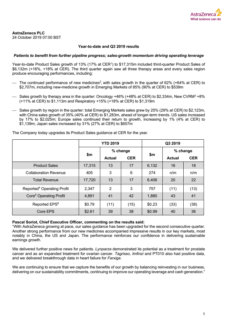 AstraZeneca PLC Year-to-date and Q3 2019 results