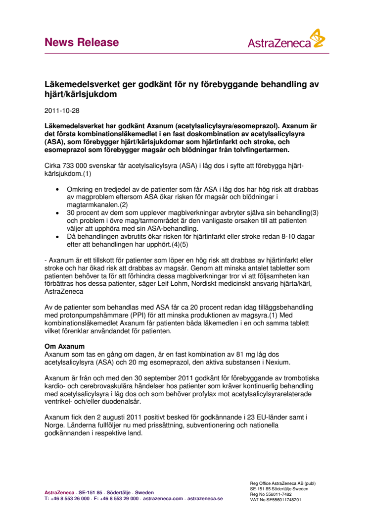 Läkemedelsverket har godkänt Axanum (acetylsalicylsyra/esomeprazol). Axanum är det första kombinationsläkemedlet i en fast doskombination av acetylsalicylsyra (ASA), som förebygger hjärt/kärlsjukdomar som hjärtinfarkt och stroke, och esomeprazol som förebygger magsår och blödningar från tolvfingertarmen.