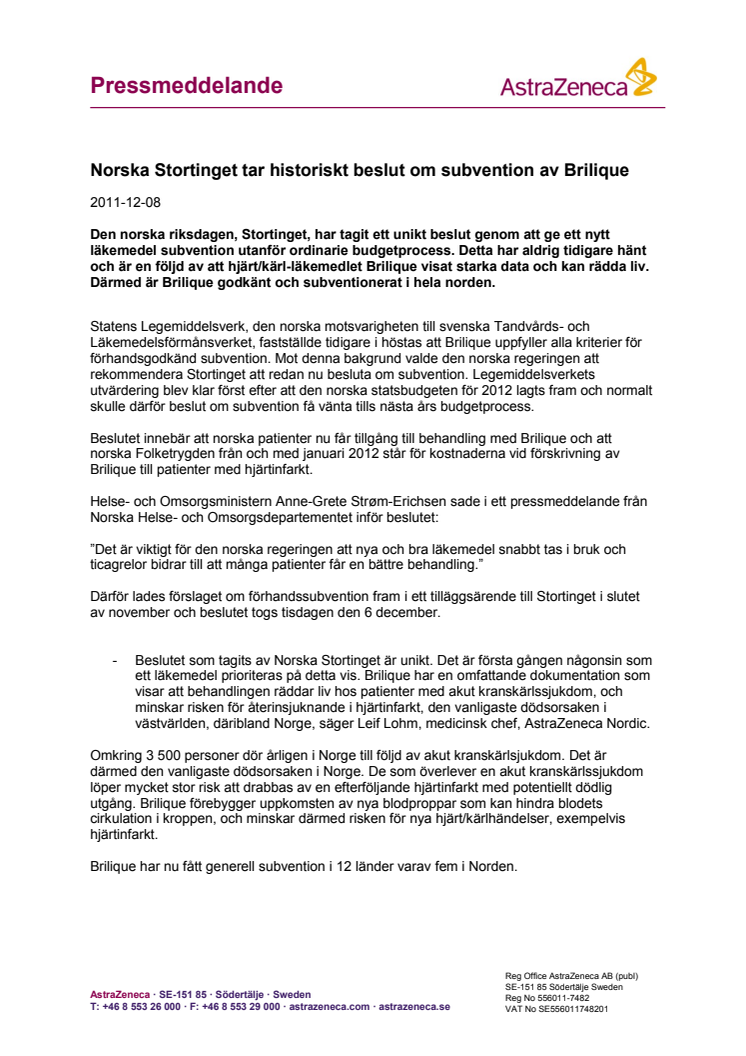 Den norska riksdagen, Stortinget, har tagit ett unikt beslut genom att ge ett nytt läkemedel subvention utanför ordinarie budgetprocess. Detta har aldrig tidigare hänt och är en följd av att hjärt/kärl-läkemedlet Brilique visat starka data och kan rädda liv. Därmed är Brilique godkänt och subventionerat i hela norden.