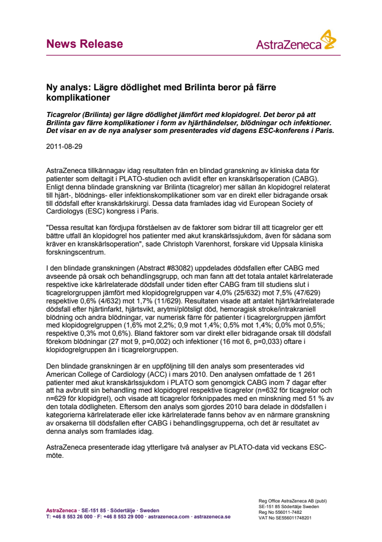 Ticagrelor (Brilinta) ger lägre dödlighet jämfört med klopidogrel. Det beror på att Brilinta gav färre komplikationer i form av hjärthändelser, blödningar och infektioner. Det visar en av de nya analyser som presenterades vid dagens ESC-konferens i Paris.