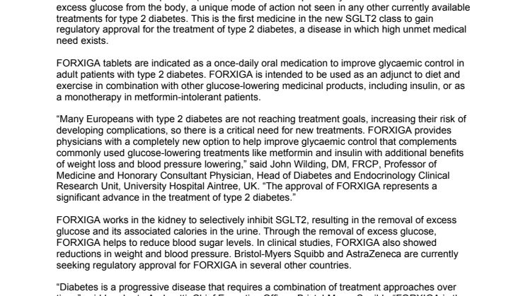 "Vi är glada över att Forxiga blivit godkänt för EU, och för det betydande framsteg detta innebär för de många miljoner patienter i Europa med typ 2-diabetes som behöver nya behandlingsalternativ för att kontrollera denna progressiva sjukdom", säger Pascal Soriot, VD och koncernchef, AstraZeneca. "Forxiga är ett viktigt tillskott till den växande arsenalen av diabetesläkemedel som utvecklas av Bristol-Myers Squibb och AstraZeneca. Detta är ytterligare ett resultat av vår satsning på att tillgodose de medicinska behoven hos vuxna med typ 2-diabetes."