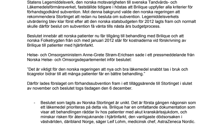 Statens Legemiddelsverk, den norska motsvarigheten till svenska Tandvårds- och Läkemedelsförmånsverket, fastställde tidigare i höstas att Brilique uppfyller alla kriterier för förhandsgodkänd subvention. Mot denna bakgrund valde den norska regeringen att rekommendera Stortinget att redan nu besluta om subvention. Legemiddelsverkets utvärdering blev klar först efter att den norska statsbudgeten för 2012 lagts fram och normalt skulle därför beslut om subvention få vänta tills nästa års budgetprocess.