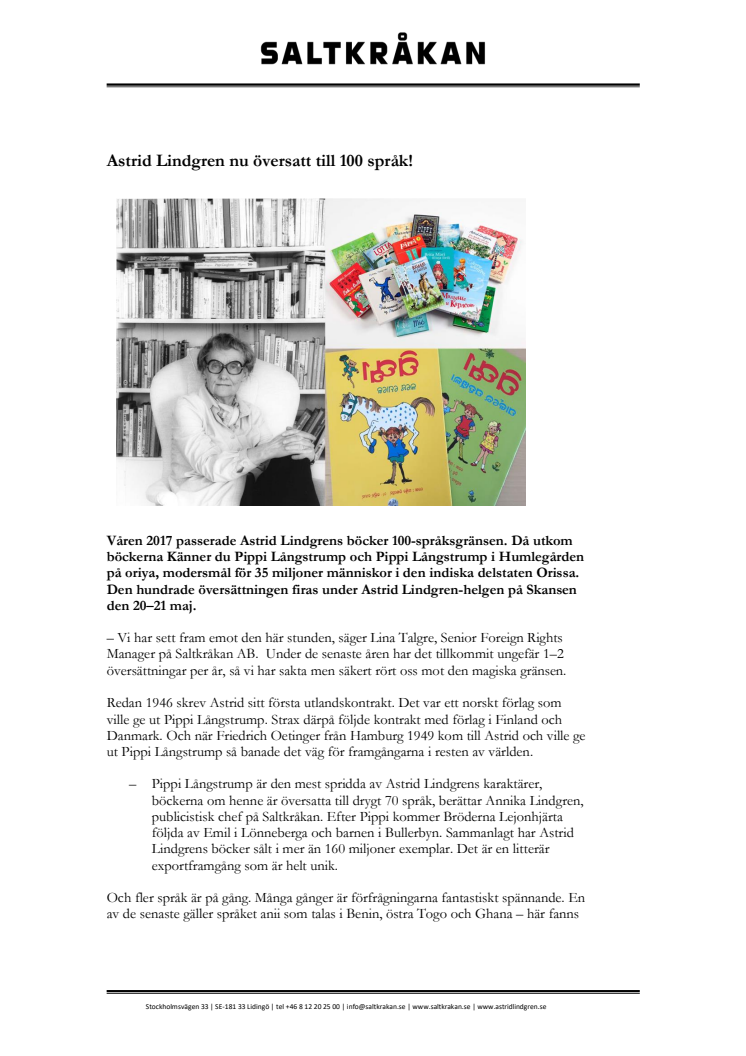 Våren 2017 passerade Astrid Lindgrens böcker 100-språksgränsen. Då utkom böckerna Känner du Pippi Långstrump och Pippi Långstrump i Humlegården på oriya, modersmål för 35 miljoner människor i den indiska delstaten Orissa. Den hundrade översättningen firas under Astrid Lindgren-helgen på Skansen den 20–21 maj.