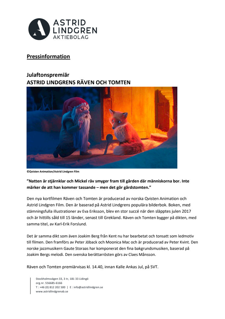 Den nya kortfilmen Räven och Tomten är producerad av norska Qvisten Animation och Astrid Lindgren Film. Den är baserad på Astrid Lindgrens populära bilderbok med illustrationer av Eva Eriksson. Joakim Berg från Kent har tonsatt ledmotivet som framförs av Peter Jöback och Moonica Mac. Den svenska berättarrösten görs av Claes Månsson. Räven och Tomten premiärvisas kl. 14.40, på SVT.