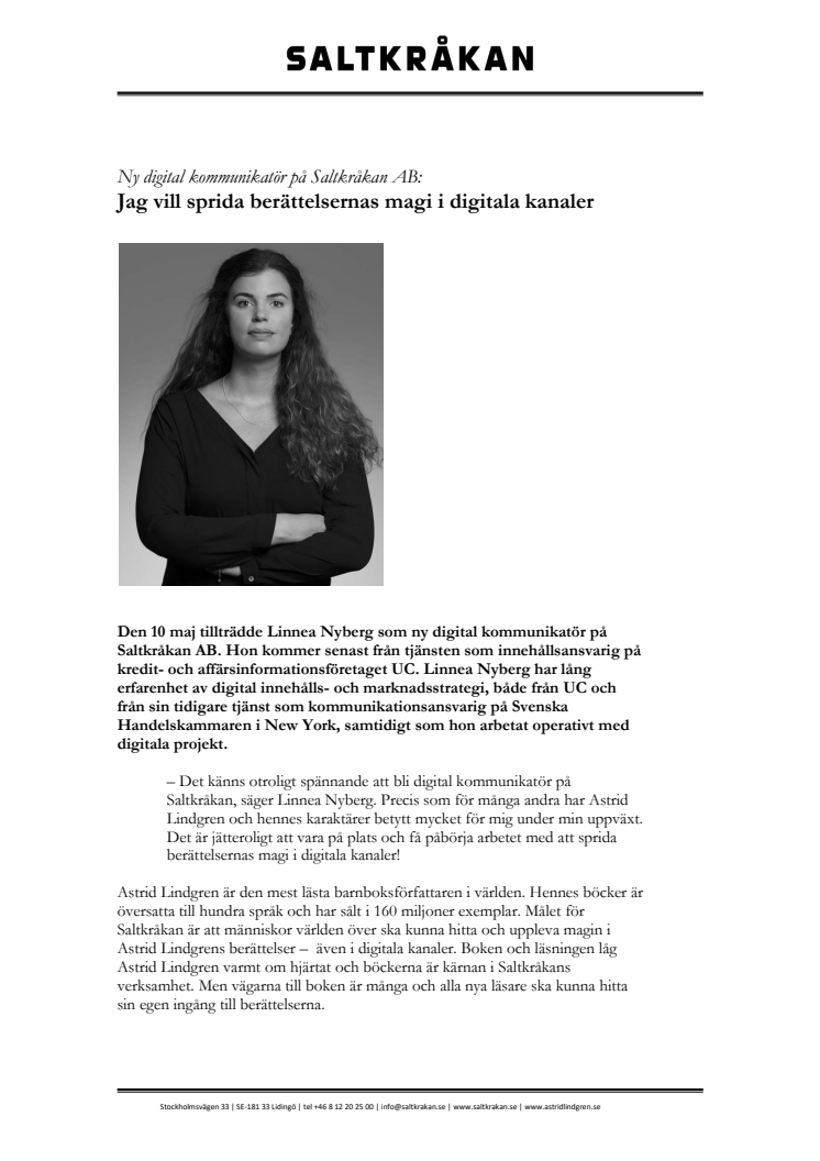 Den 10 maj tillträdde Linnea Nyberg som ny digital kommunikatör på Saltkråkan AB. Hon kommer senast från tjänsten som innehållsansvarig på kredit- och affärsinformationsföretaget UC. Linnea Nyberg har lång erfarenhet av digital innehålls- och marknadsstrategi, både från UC och från sin tidigare tjänst på Svenska Handelskammaren i New York, samtidigt som hon arbetat operativt med digitala projekt.