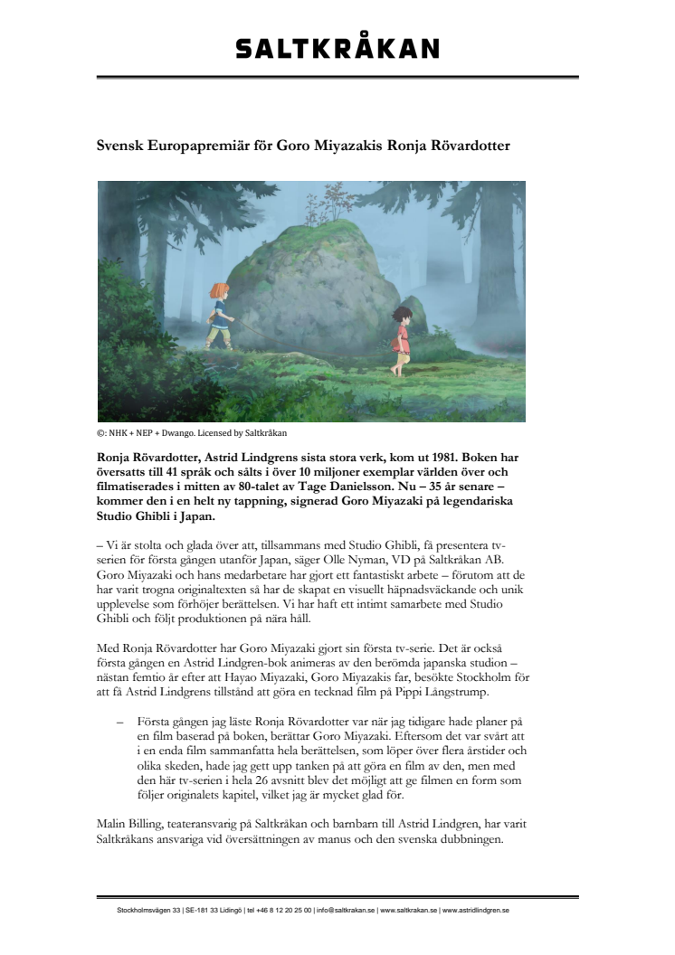 Ronja Rövardotter, Astrid Lindgrens sista stora verk, kom ut 1981. Boken har översatts till 41 språk och sålts i över 10 miljoner exemplar världen över och filmatiserades i mitten av 80-talet av Tage Danielsson. Nu – 35 år senare – kommer den i en helt ny tappning, signerad Goro Miyazaki på legendariska Studio Ghibli i Japan.