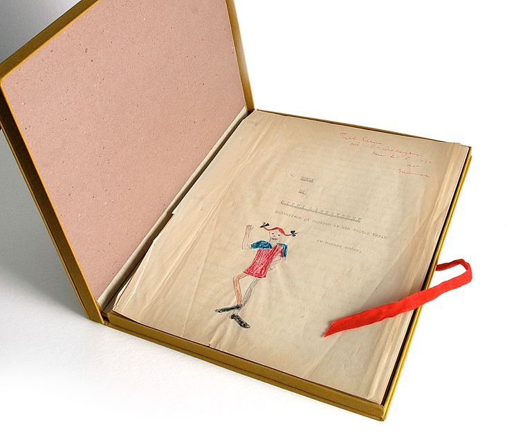 Urmanuset till Pippi Långstrump som Astrid Lindgrens dotter Karin fick i födelsedagspresent. / Astrid Lindgren's first Pippi Longstocking manuscript, gifted to her daughter Karin on her tenth birthday.