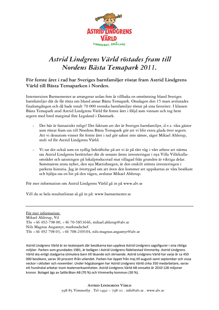 För femte året i rad har Sveriges barnfamiljer röstat fram Astrid Lindgrens Värld till Bästa Temaparken i Norden.