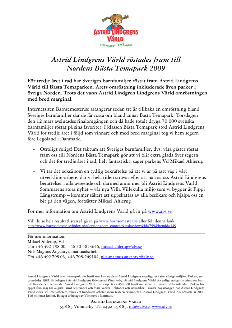 För tredje året i rad har Sveriges barnfamiljer röstat fram Astrid Lindgrens Värld till Bästa Temaparken. Årets omröstning inkluderade även parker i övriga Norden. Trots det vann Astrid Lindgren Lindgrens Värld omröstningen med bred marginal.