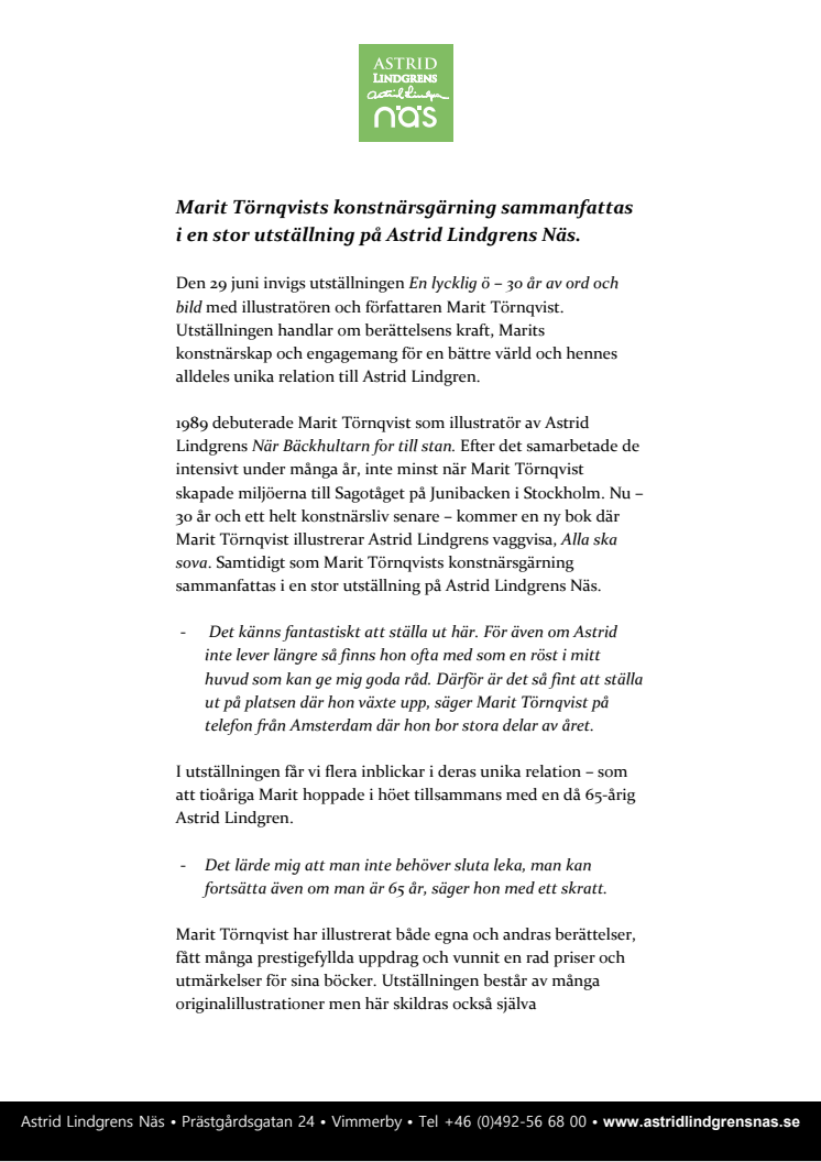 Den 29 juni invigs utställningen En lycklig ö – 30 år av ord och bild med illustratören och författaren Marit Törnqvist. Utställningen handlar om berättelsens kraft, Marits konstnärskap och engagemang för en bättre värld och hennes alldeles unika relation till Astrid Lindgren.