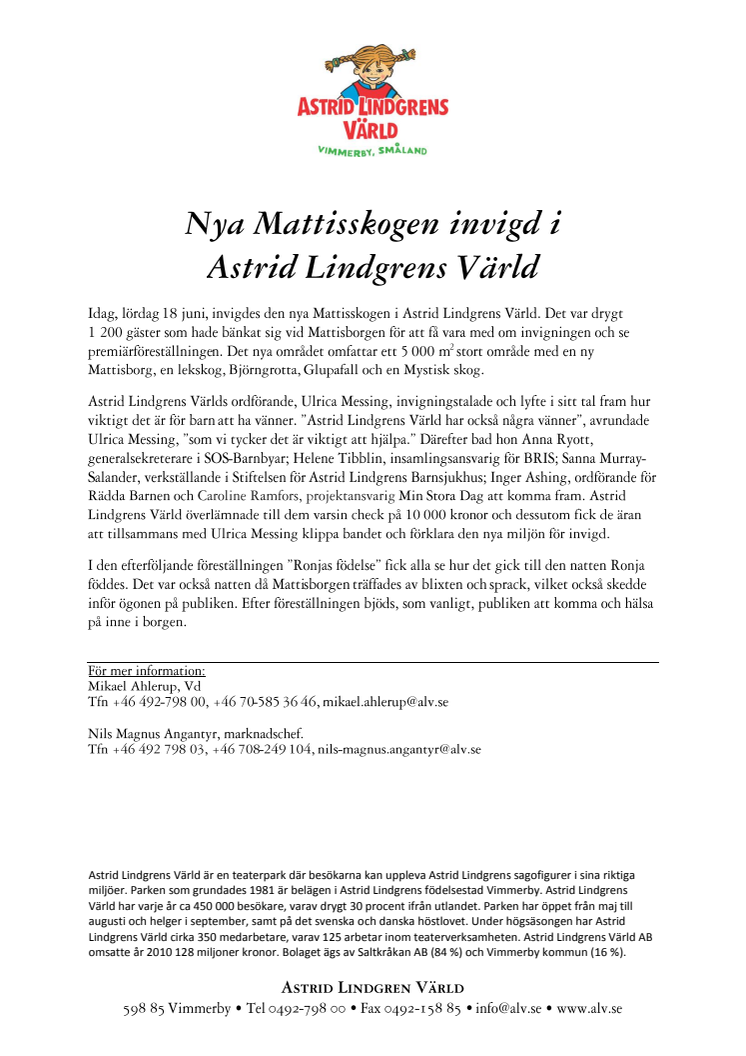 Idag, lördag 18 juni, invigdes den nya Mattisskogen i Astrid Lindgrens Värld. Det var drygt 1 200 gäster som hade bänkat sig vid Mattisborgen för att få vara med om invigningen och se premiärföreställningen. Det nya området omfattar ett 5 000 m2 stort område med en ny Mattisborg, en lekskog, Björngrotta, Glupafall och en Mystisk skog.