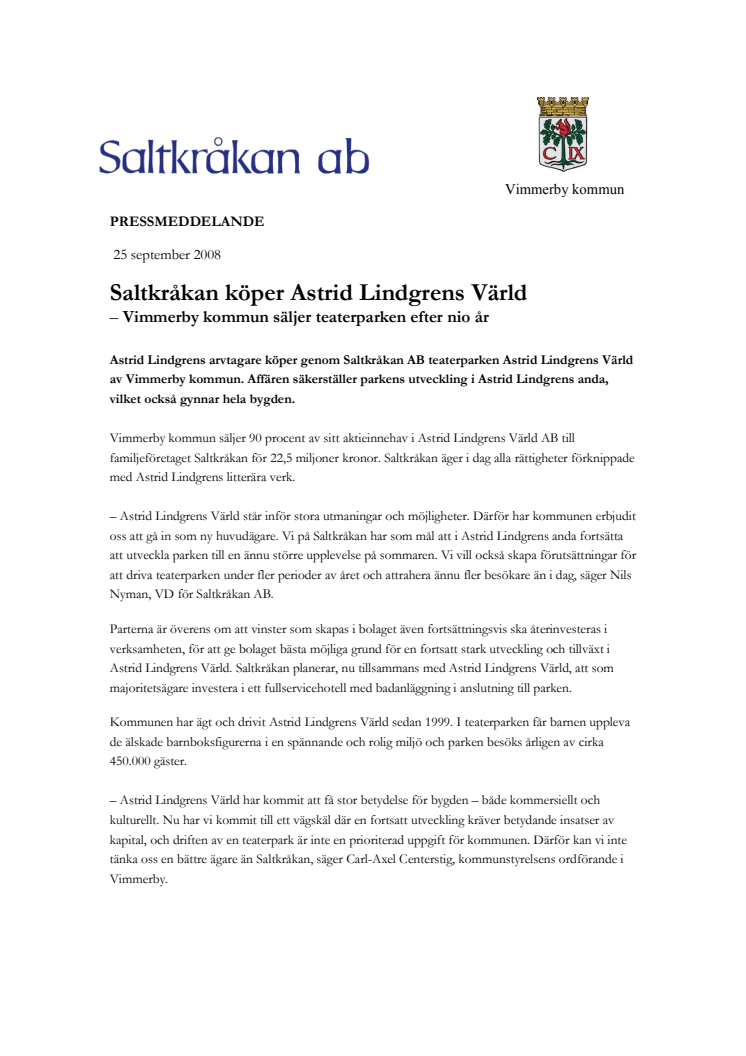 Astrid Lindgrens arvtagare köper genom Saltkråkan AB teaterparken Astrid Lindgrens Värld av Vimmerby kommun. Affären säkerställer parkens utveckling i Astrid Lindgrens anda, vilket också gynnar hela bygden.