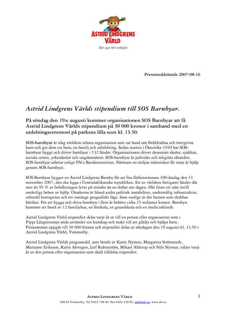 På söndag den 19:e augusti kommer organisationen SOS Barnbyar att få Astrid Lindgrens Världs stipendium på 30 000 kronor i samband med en utdelningsceremoni på parkens lilla scen kl. 13.50.