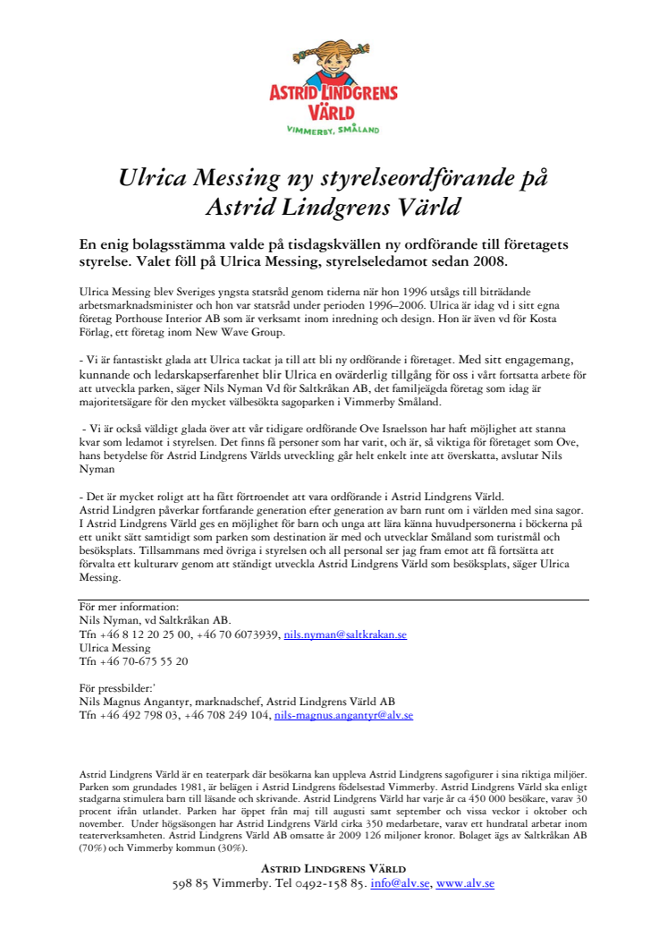 Ulrica Messing ny styrelseordförande på Astrid Lindgrens Värld