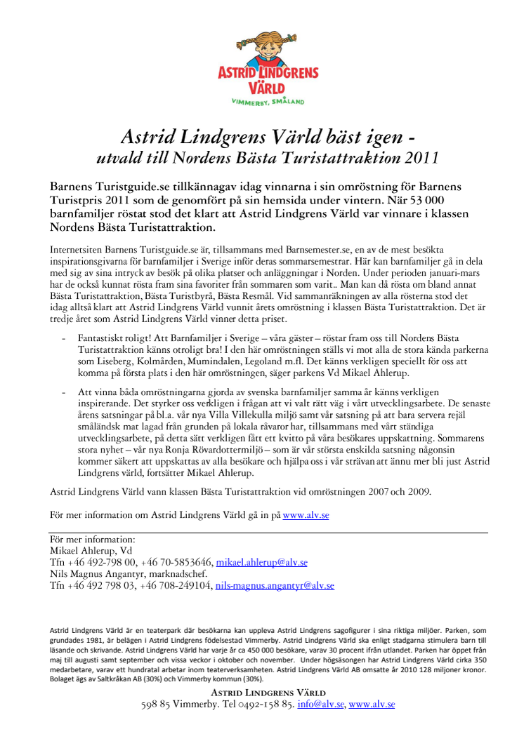 Barnens Turistguide.se tillkännagav idag vinnarna i sin omröstning för Barnens Turistpris 2011 som de genomfört på sin hemsida under vintern. När 53 000 barnfamiljer röstat stod det klart att Astrid Lindgrens Värld var vinnare i klassen Nordens Bästa Turistattraktion.