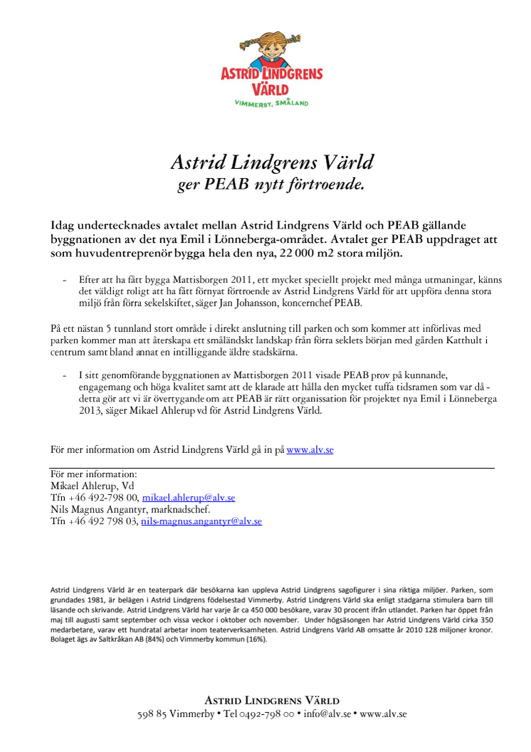 - I sitt genomförande byggnationen av Mattisborgen 2011 visade PEAB prov på kunnande, engagemang och höga kvalitet samt att de klarade att hålla den mycket tuffa tidsramen som var då - detta gör att vi är övertygande om att PEAB är rätt organissation för projektet nya Emil i Lönneberga 2013, säger Mikael Ahlerup vd för Astrid Lindgrens Värld.