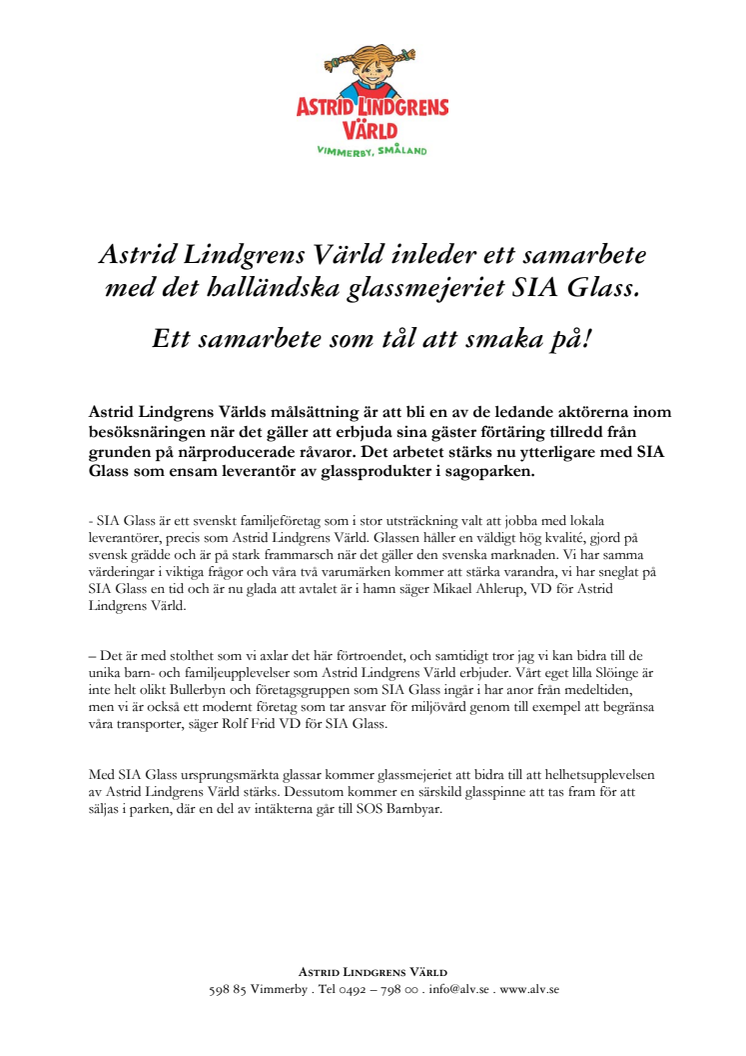 - SIA Glass är ett svenskt familjeföretag som i stor utsträckning valt att jobba med lokala leverantörer, precis som Astrid Lindgrens Värld. Glassen håller en väldigt hög kvalité, gjord på svensk grädde och är på stark frammarsch när det gäller den svenska marknaden. Vi har samma värderingar i viktiga frågor och våra två varumärken kommer att stärka varandra, vi har sneglat på SIA Glass en tid och är nu glada att avtalet är i hamn säger Mikael Ahlerup, VD för Astrid Lindgrens Värld.