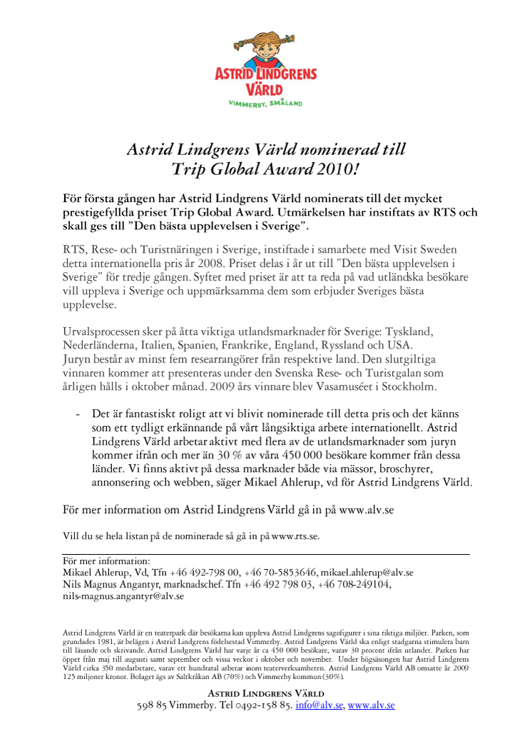 - Det är fantastiskt roligt att vi blivit nominerade till detta pris och det känns som ett tydligt erkännande på vårt långsiktiga arbete internationellt. Astrid Lindgrens Värld arbetar aktivt med flera av de utlandsmarknader som juryn kommer ifrån och mer än 30 % av våra 450 000 besökare kommer från dessa länder. Vi finns aktivt på dessa marknader både via mässor, broschyrer, annonsering och webben, säger Mikael Ahlerup, vd för Astrid Lindgrens Värld.