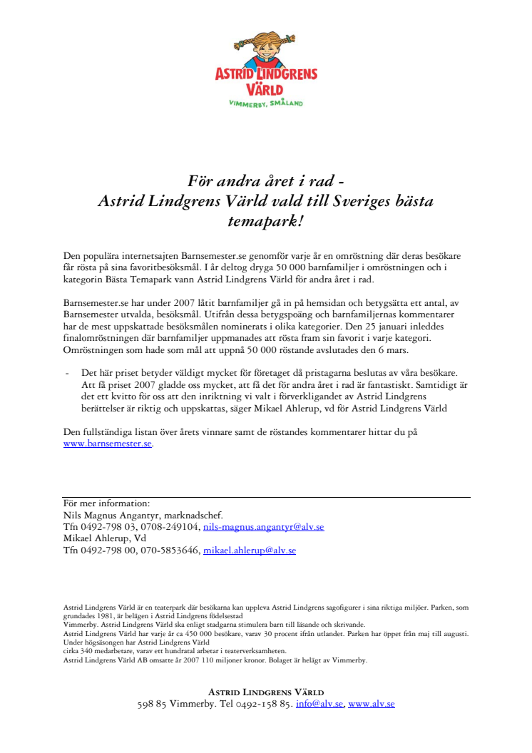 - Det här priset betyder väldigt mycket för företaget då pristagarna beslutas av våra besökare. Att få priset 2007 gladde oss mycket, att få det för andra året i rad är fantastiskt. Samtidigt är det ett kvitto för oss att den inriktning vi valt i förverkligandet av Astrid Lindgrens berättelser är riktig och uppskattas, säger Mikael Ahlerup, vd för Astrid Lindgrens Värld