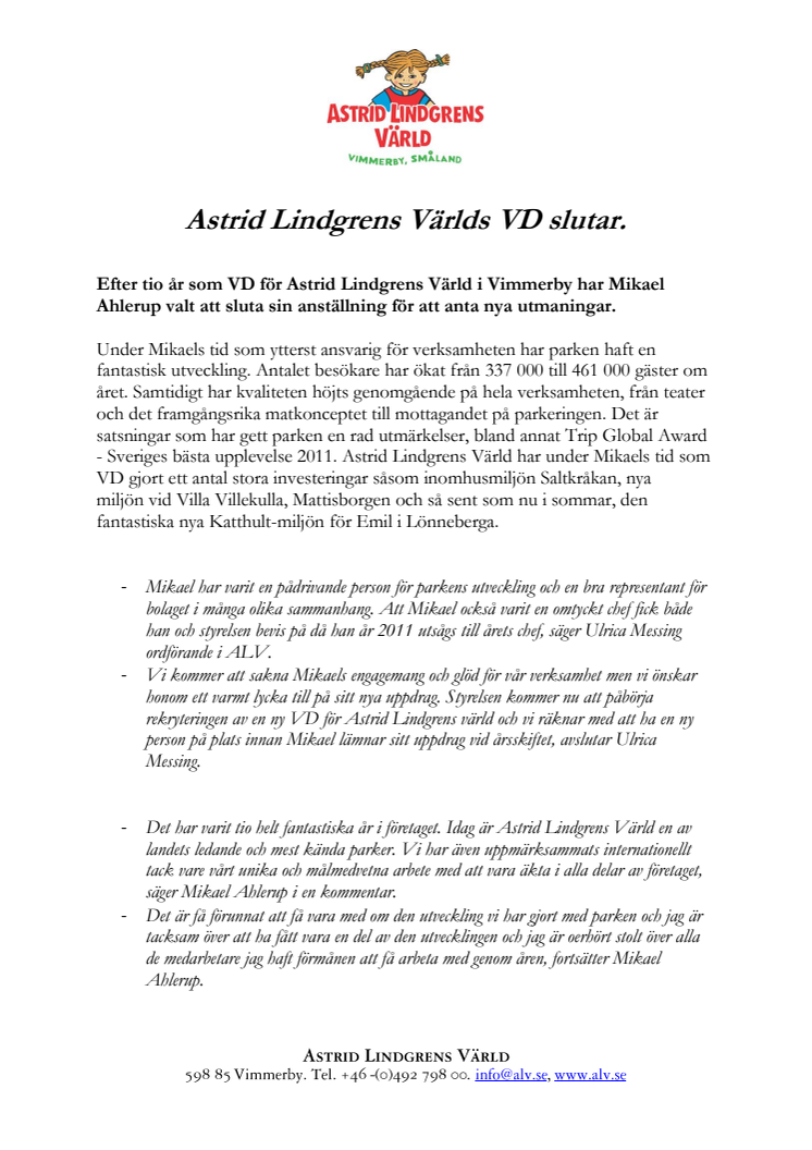 - Det har varit tio helt fantastiska år i företaget. Idag är Astrid Lindgrens Värld en av landets ledande och mest kända parker. Vi har även uppmärksammats internationellt tack vare vårt unika och målmedvetna arbete med att vara äkta i alla delar av företaget, säger Mikael Ahlerup i en kommentar.