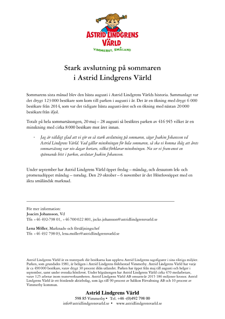 - -Jag är väldigt glad att vi gör en så stark avslutning på sommaren, säger Joakim Johansson vd Astrid Lindgrens Värld. Vad gäller minskningen för hela sommaren, så ska vi komma ihåg att årets sommarsäsong var nio dagar kortare, vilket förklarar minskningen. Nu ser vi fram emot en spännande höst i parken, avslutar Joakim Johansson.