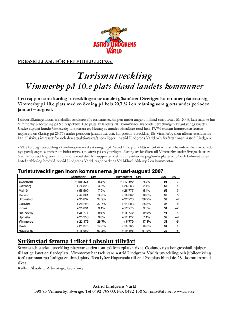I undersökningen, som innehåller resultatet för turismutvecklingen under augusti månad samt totalt för 2008, kan man se hur Vimmerby placerar sig på 9.e respektive 10.e plats av landets 281 kommuner avseende utvecklingen av antalet gästnätter. Under augusti kunde Vimmerby konstatera en ökning av antalet gästnätter med hela 47,7% medan kommunen kunde registrera en ökning på 29,7% under perioden januari-augusti. En positiv utveckling för Vimmerby som nästan uteslutande kan tillskrivas intresset för och den attraktionskraft som ligger i Astrid Lindgrens Värld och författarinnan Astrid Lindgren.
