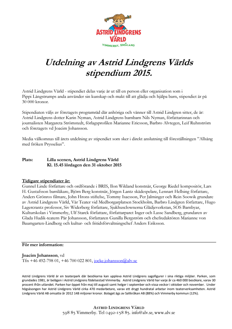 Astrid Lindgrens Värld - stipendiet delas varje år ut till en person eller organisation som i