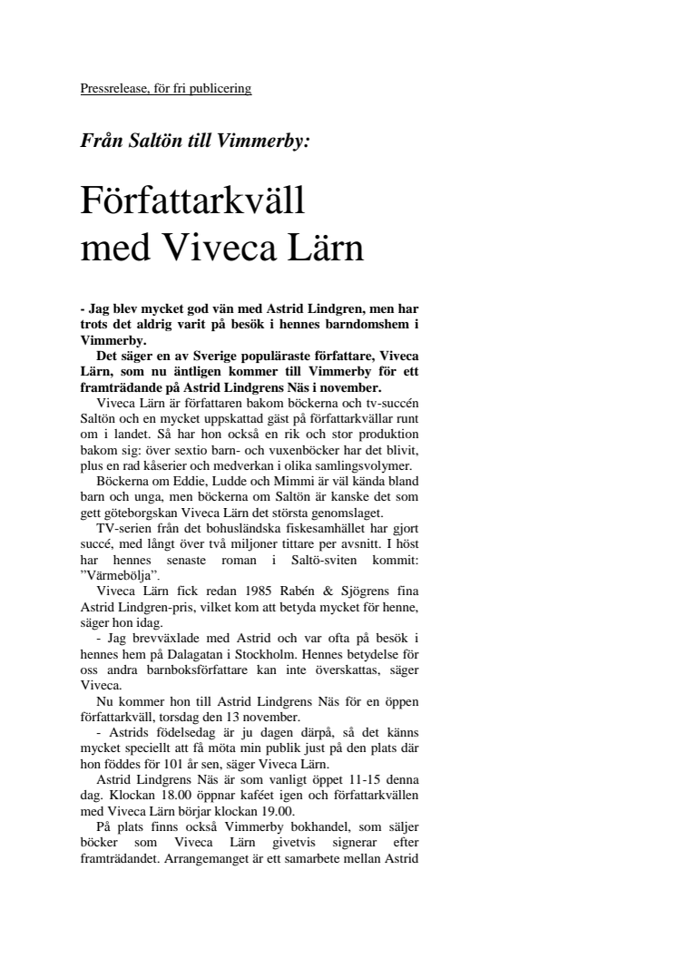 Författarkväll med Viveca Lärn på Astrid Lindgrens Näs