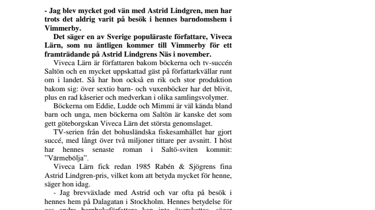 Det säger en av Sverige populäraste författare, Viveca Lärn, som nu äntligen kommer till Vimmerby för ett framträdande på Astrid Lindgrens Näs i november.