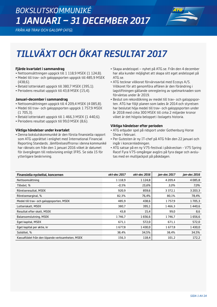 Det visar AB Trav och Galopps (ATG) bokslutskommuniké för 2017.