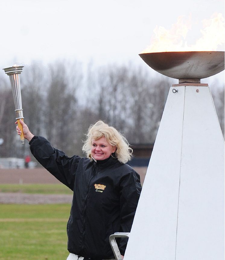 Anette Norberg tänder elden på Mantorp i en deltävling av Olympiatravet 2010.