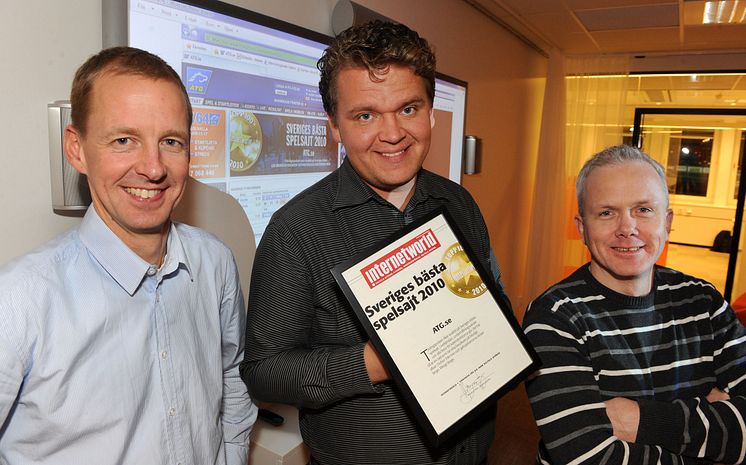 ATG.se är utsedd till Sveriges bästa spelsajt. Idel glada miner hos Peter Ågren, ansvarig för ATG.se hos ATG, Petri Johansson, huvudredaktör web, Kanal 75 och Patrik Oscarsson, webdesigner på Kanal 75.