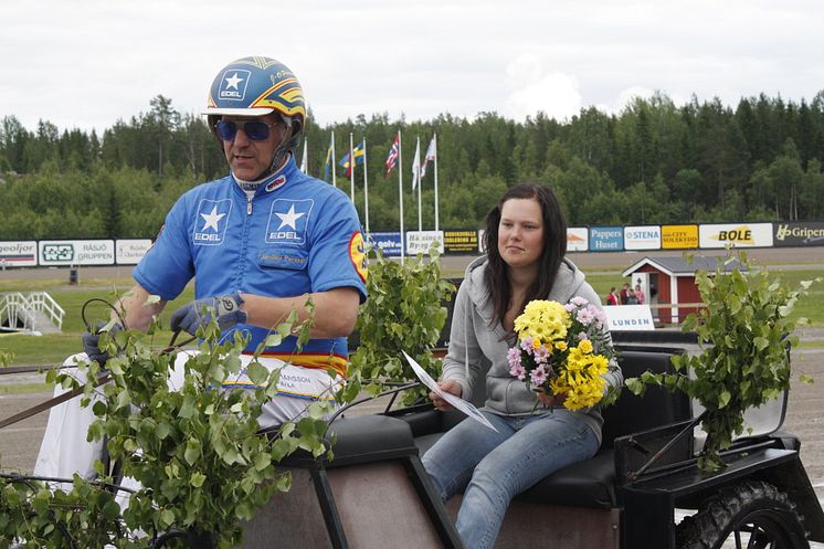 Under midsommaraftonen fick Emelie Mood ta emot Järvsöfaks Ungdomsstipendium. Här är hon på väg fram till prisutdelningen. Jan-Olov Persson kör Järvsöfaks och Emelie Mood åker i lövad vagn.