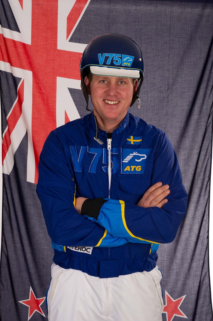 Jörgen Westholm i den V75-dress som han ska tävla i på Nya Zeeland.