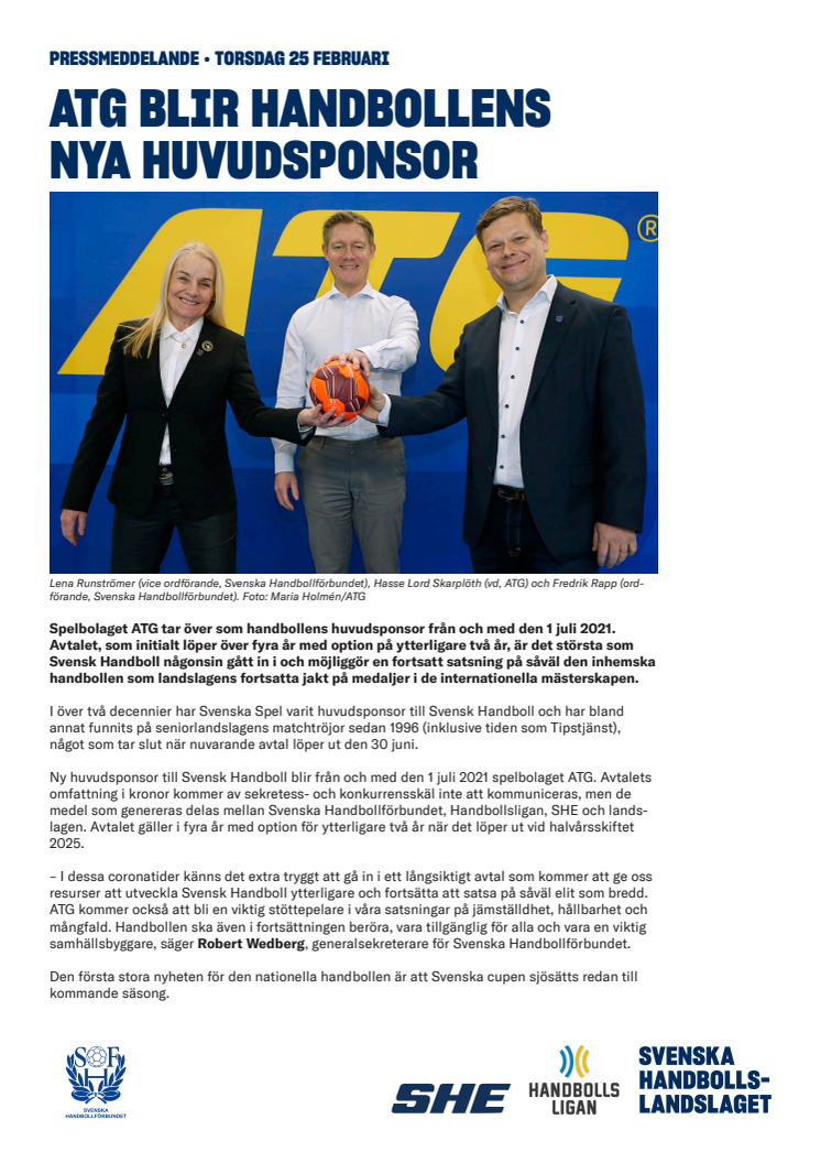 – Vi ser fram emot att arbeta med ATG och vill samtidigt passa på att tacka Svenska Spel som har varit en fantastisk partner till Svensk Handboll i många år. De har varit en viktig del på herrlands- lagets resa tillbaka till världstoppen, damlandslagets första mästerskapsmedaljer och utvecklingen av Handbollsligan och SHE. Dessutom har de betytt mycket för föreningarna ute i landet som fost- rar ungdomar inte bara till att bli bättre handbollsspelare utan framför allt för att bidra till ett bättre samhälle.