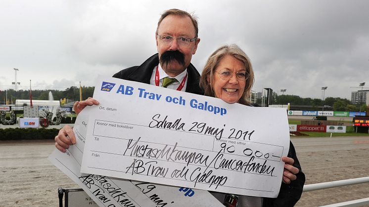 Efter söndagens första lopp, Mustaschloppet, överräckte ATG:s VD Remy Nilson en check till Cancerfonden på 180 000 kronor.