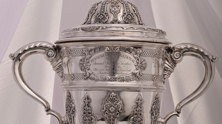 Det är denna pokal, 7 140 gram sterling silver (dubbelt så tung med foten) och 48 cm hög, som Elisabeth Oldengren nu har med sig till England. Pokalen kommer att stå i en speciell monter på banans museum och historien om hur en engelsk Grand National-pokal hamnade som uppskattat vandringspris i Svenskt Grand National kommer också att berättas på banan och i något av dagarnas programblad.
