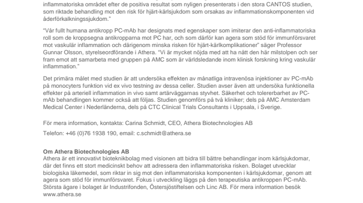 “Vår fullt humana antikropp PC-mAb har designats med egenskaper som imiterar den anti-inflammatoriska roll som de kroppsegna antikropparna mot PC har, och som därför kan agera som stöd för immunförsvaret mot vaskulär inflammation och därigenom minska risken för hjärt-kärlkomplikationer” säger Professor Gunnar Olsson, styrelseordförande i Athera. “Vi är mycket nöjda med att ha nått den här milstolpen och ser fram emot att samarbeta med gruppen på AMC som är världsledande inom klinisk forskning kring vaskulär inflammation.”