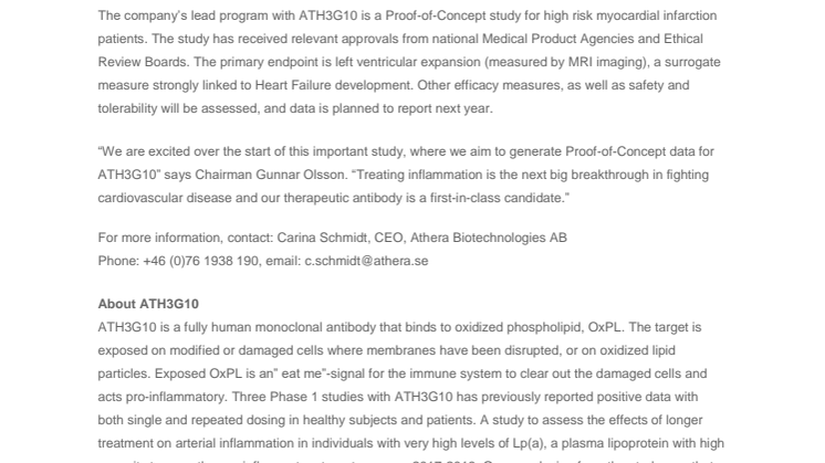 “We are excited over the start of this important study, where we aim to generate Proof-of-Concept data for ATH3G10” says Chairman Gunnar Olsson. “Treating inflammation is the next big breakthrough in fighting cardiovascular disease and our therapeutic antibody is a first-in-class candidate.”