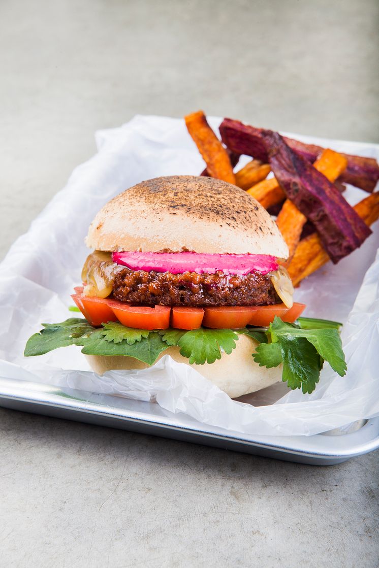 Vegansk burgare med saftig, köttliknande textur gjord på ärtprotein, svamp och rödbetor. Ett växtbaserat protein med smak av umami.