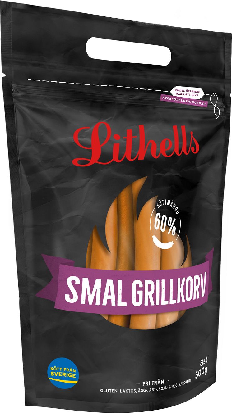 Den smala grillkorven har en klassisk grillkorvssmak och ett härligt knäck när man biter i den. Grillkorv är det största segmentet i korvhyllan och nu lanserar Lithells en smal variant med skinn som kommer att finnas över hela landet. Grillsortimentet är tillverkat av svensk köttråvara med naturskinn och rökt på traditionellt vis med rökspån – du känner igen dem på den smarta, återförslutningsbara ståpåsen i svart. Kötthalt 60%, 8 korvar per förpackning om 500 g, cirkapris 42 kr.