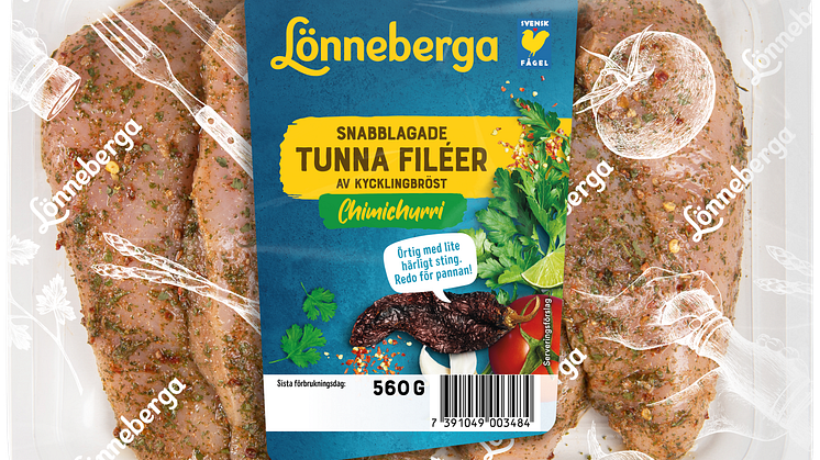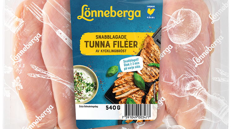 Vardagsmiddagen är räddad! Lönneberga lanserar tunna kycklingfiléer som är snabba och enkla att tillaga. Till de tunna filéerna används enbart den finaste övre halvan av bröstfilén, så de kan gå rakt i pannan utan att ansas. Välj mellan tunna kycklingfiléer och tunna kycklingfiléer Chimichurri.