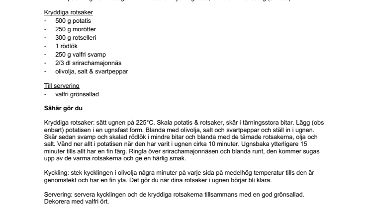 Snabblagad Chimichurrikyckling - rotsaker & annat gott på plåt vänds i srirachamayo och toppas med stekta tunna filéer färdigkryddade med chimichurri. Snabblagad kycklinggratäng - tunna filéer naturella, parmesancrème och purjolök tillagas i ugn och toppas med en tomatvinägrett vid servering. Recept bifogat.