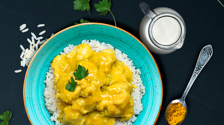 - Krämig currysås med en egen framtagen lite hetare gul curry, kycklingfond, grädde och crème fraiche.