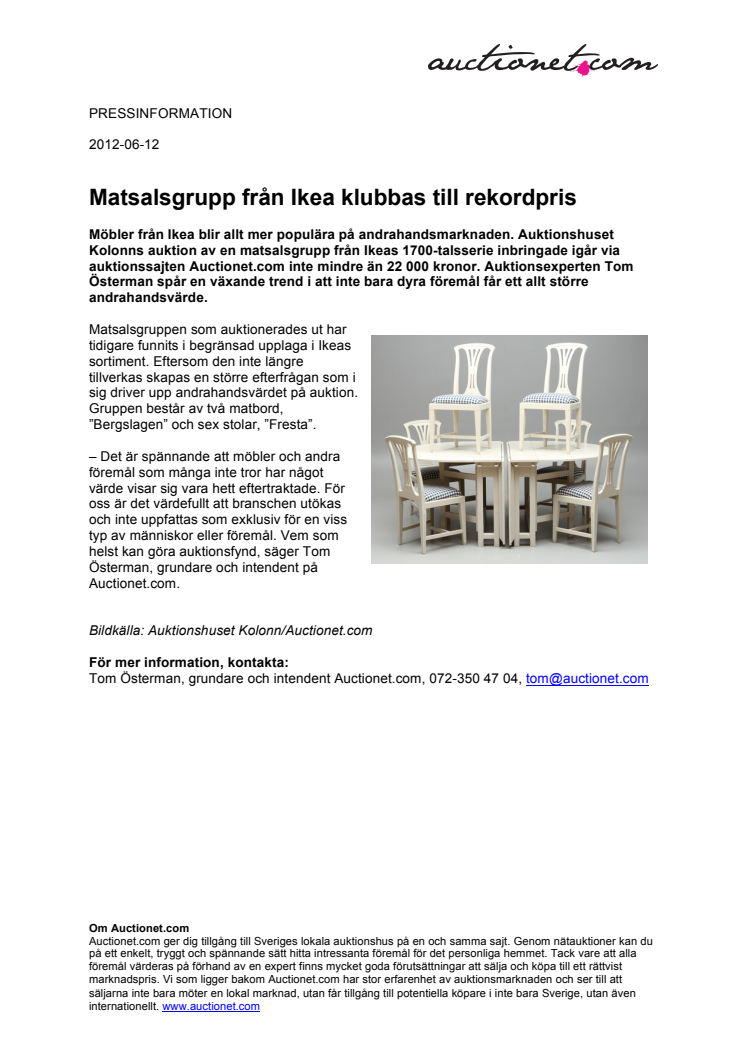 Möbler från Ikea blir allt mer populära på andrahandsmarknaden. Auktionshuset Kolonns auktion av en matsalsgrupp från Ikeas 1700-talsserie inbringade igår via auktionssajten Auctionet.com inte mindre än 22 000 kronor. Auktionsexperten Tom Österman spår en växande trend i att inte bara dyra föremål får ett allt större andrahandsvärde.