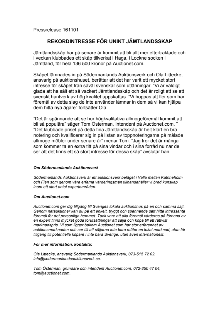 Jämtlandsskåp har på senare år kommit att bli allt mer eftertraktade och i veckan klubbades ett skåp tillverkat i Haga, i Lockne socken i Jämtland, för hela 136 500 kronor på Auctionet.com.