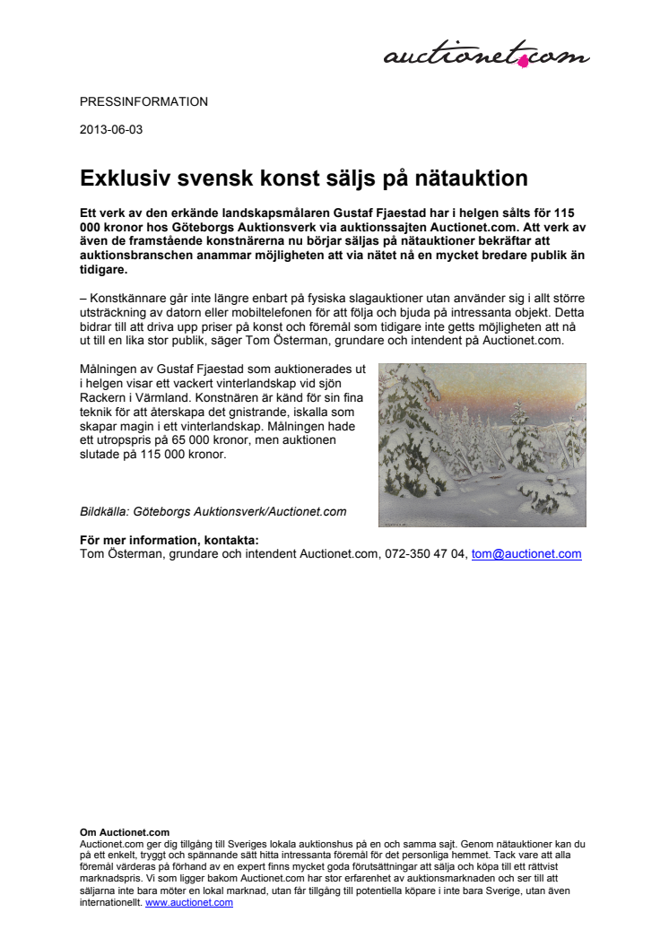 Ett verk av den erkände landskapsmålaren Gustaf Fjaestad har i helgen sålts för 115 000 kronor hos Göteborgs Auktionsverk via auktionssajten Auctionet.com. Att verk av även de framstående konstnärerna nu börjar säljas på nätauktioner bekräftar att auktionsbranschen anammar möjligheten att via nätet nå en mycket bredare publik än tidigare.