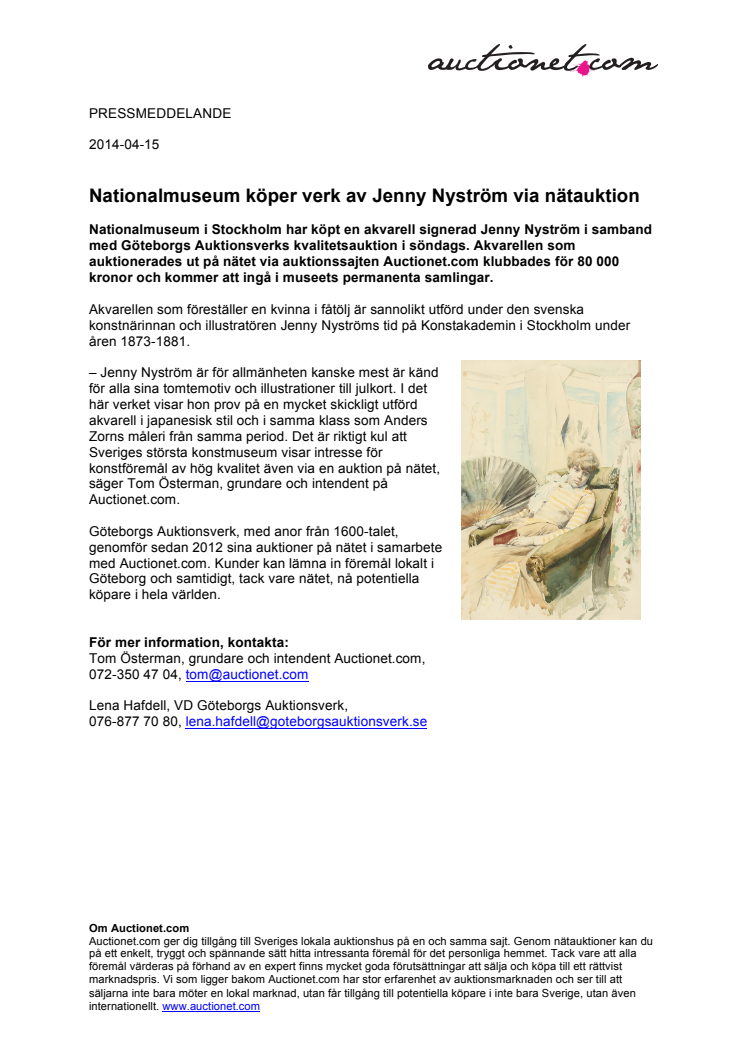 – Jenny Nyström är för allmänheten kanske mest är känd för alla sina tomtemotiv och illustrationer till julkort. I det här verket visar hon prov på en mycket skickligt utförd akvarell i japanesisk stil och i samma klass som Anders Zorns måleri från samma period. Det är riktigt kul att Sveriges största konstmuseum visar intresse för konstföremål av hög kvalitet även via en auktion på nätet, säger Tom Österman, grundare och intendent på Auctionet.com.
