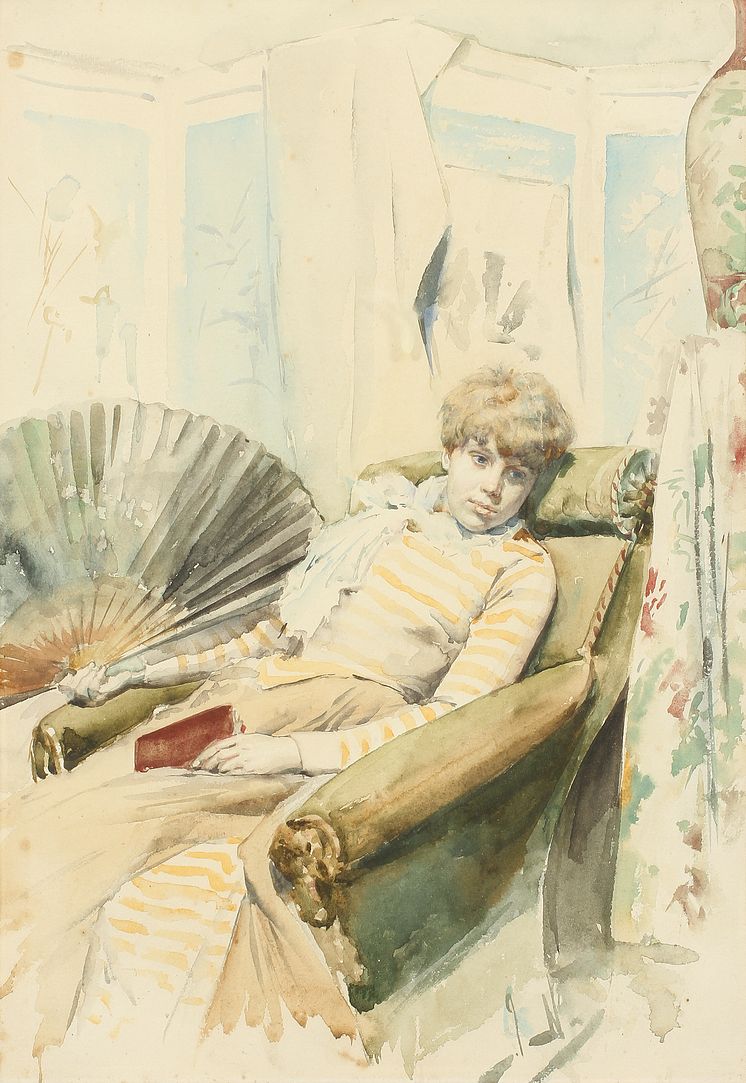 Akvarellen som föreställer en kvinna i fåtölj är sannolikt utförd under den svenska konstnärinnan och illustratören Jenny Nyströms tid på Konstakademin i Stockholm under åren 1873-1881.