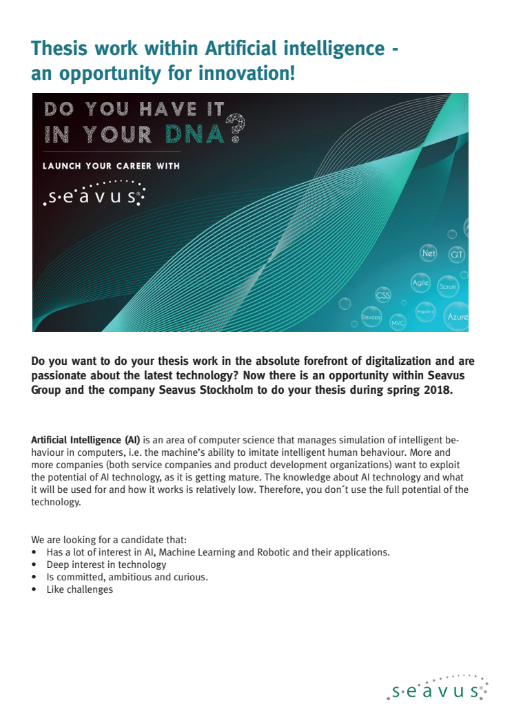 Seavus har flera intressanta examensjobb att erbjuda inom bland annat Artificiell intelligens och Machine Learning. Är du student och behöver ett exjobb inför våren 2018 så kan Seavus erbjuda dig många möjligheter.